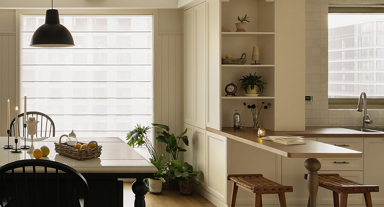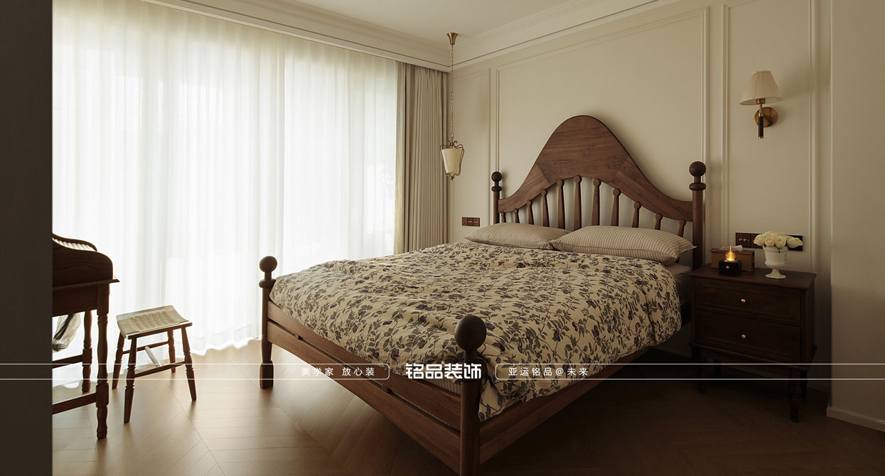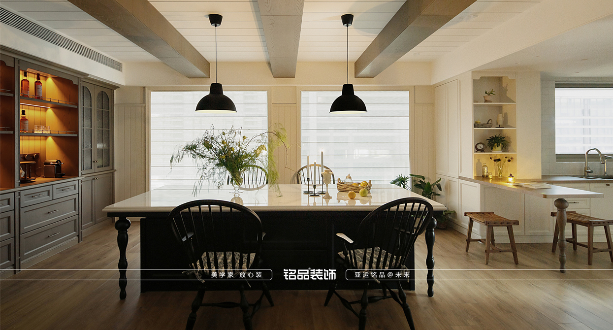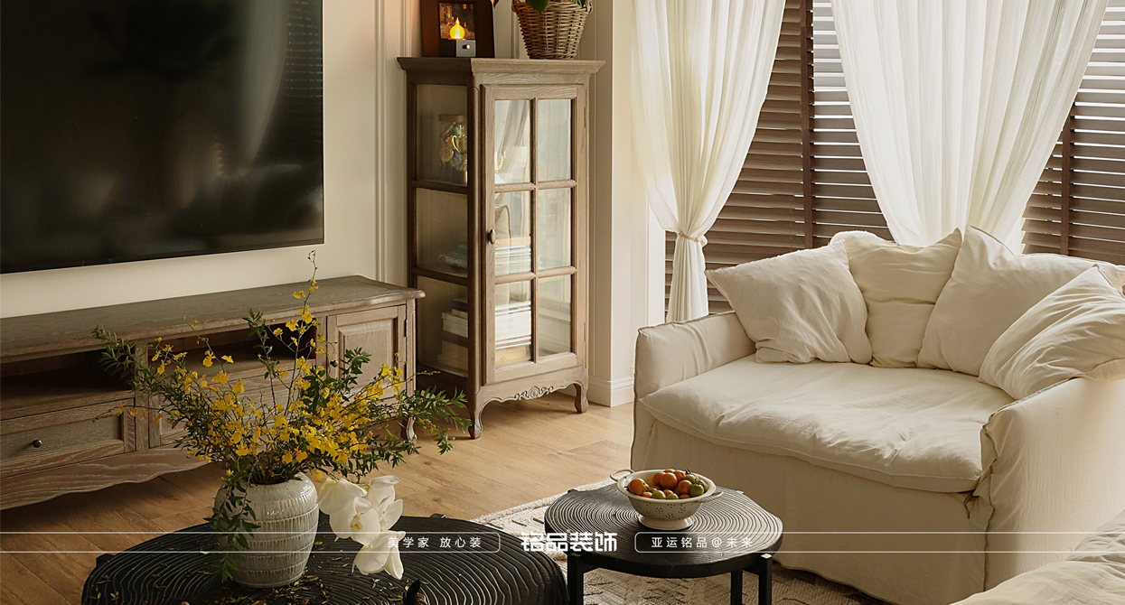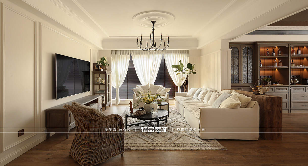 本案原本的是四房的配置,摒弃了两房改成一个大横厅的感觉,从局促的空间调整成大平层的视野感,实用自然元素,整体使空间返璞归真。 色彩:中性基调(米白、浅灰)搭配低饱和度色彩 · 线条与结构:雕花灯盘、对称门廊、人字拼木地板、拱形门洞。 · 材质:天然石材、原木、锻铁、亚麻、丝绸。 · 装饰细节:大型镜子、水晶吊灯、艺术画作、复古镜框、花艺。